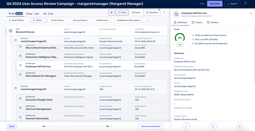 Traditional certification processes often rely on manual processes and can be time consuming and error prone. Certifiers also suffer from identity certification fatigue, leading to ongoing challenges with rubber stamping access. In a traditional review process, a user might not understand what access to revoke due to a lack of insights. With Saviynt, certifiers are given a trust score based on numerous environmental risk signals as well as recommendations as to why, or why not, an access decision should be made. This level of detail allows decision-makers to make more accurate and confident decisions.